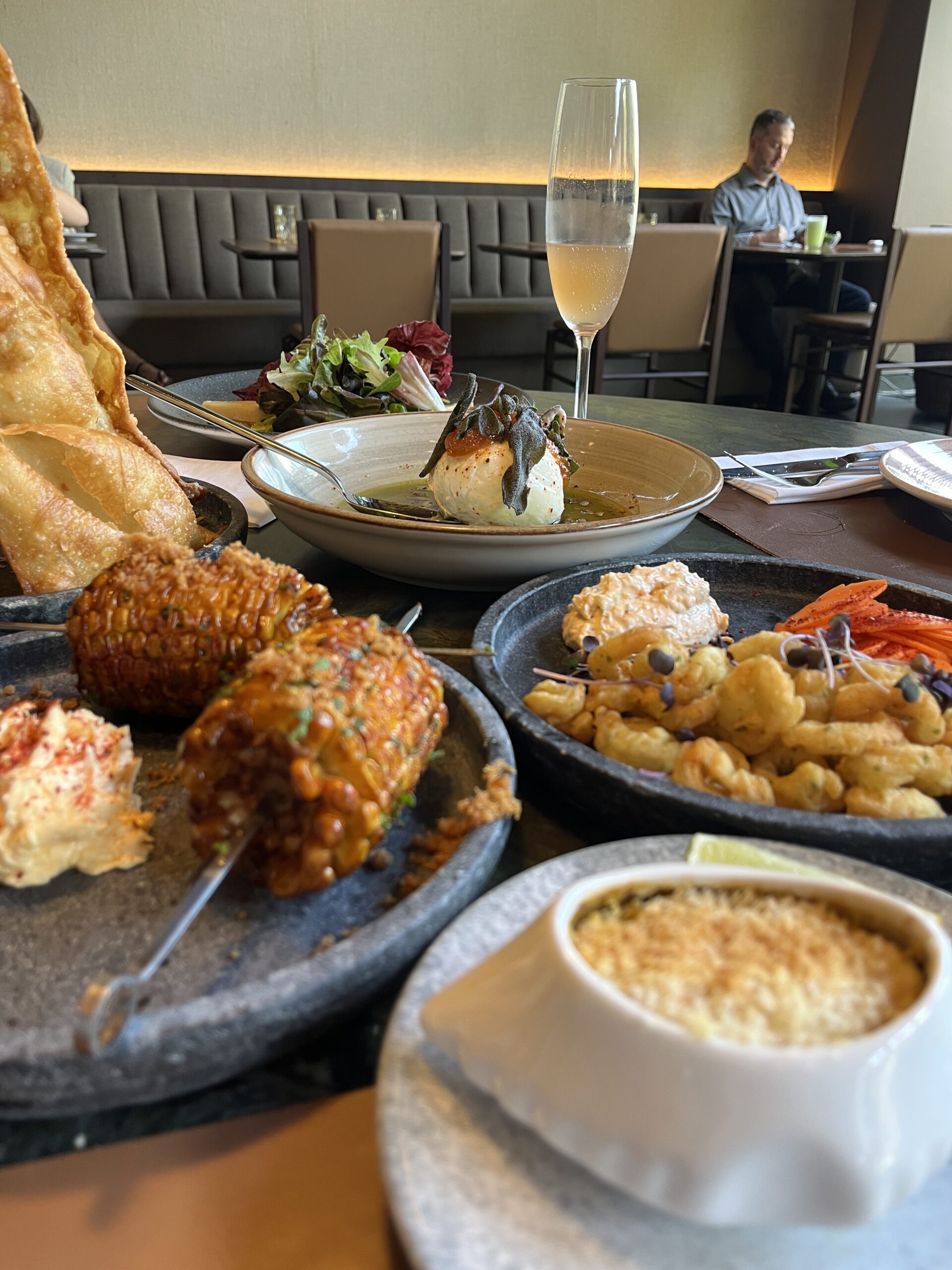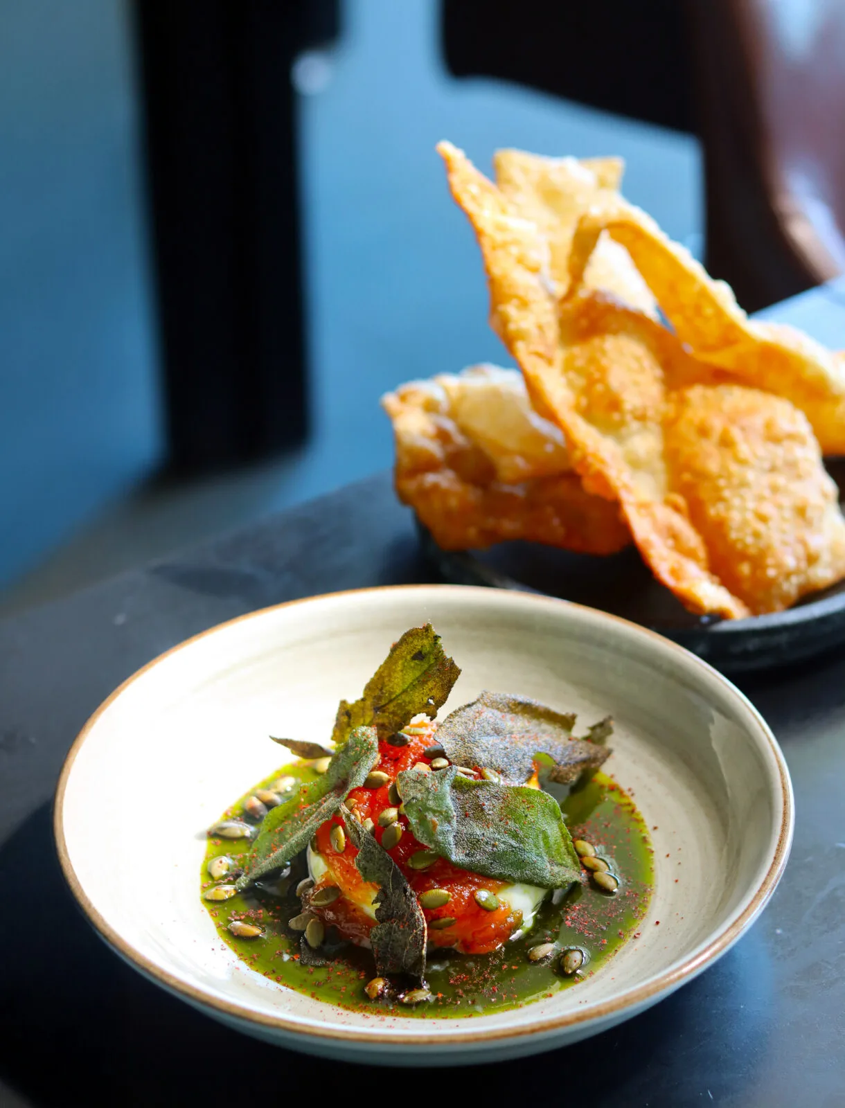 O ambiente é moderno, aconchegante e te convida a chegar e ficar à vontade — iluminação baixa, mesas bem postas e aquela atmosfera que mistura sofisticação com acolhimento. A adega é um capítulo à parte, recheada de rótulos gaúchos que reforçam o compromisso com o que é daqui. Nós escolhemos um Pet Nat, espumante produzido pelo método ancestral, mais rústico e de baixa intervenção, leve e cheio de personalidade. Mas tu pode abrir a adega e escolher o que mais convém com o momento, entre tintos, brancos, rosés e, claro, espumantes.